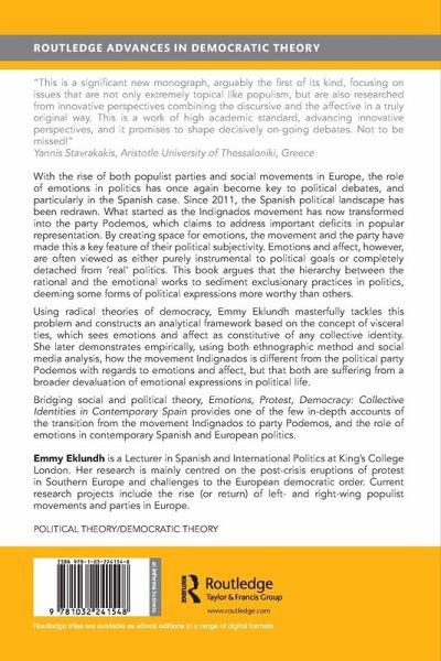 With the rise of both populist parties and social movements in Europe, the role of emotions in politics has once again become key to political debates, and particularly in the Spanish case. Since 2011, the Spanish political landscape has been redrawn. What started as the Indignados movement has now transformed into the party Podemos, which claims to address important deficits in popular representation. By creating space for emotions, the movement and the party have made this a key feature of their political subjectivity. Emotions and affect, however, are often viewed as either purely instrumental to political goals or completely detached from 'real' politics. This book argues that the hierarchy between the rational and the emotional works to sediment exclusionary practices in politics, deeming some forms of political expressions more worthy than others. Using radical theories of democracy, Emmy Eklundh masterfully tackles this problem and constructs an analytical framework based on the concept of visceral ties, which sees emotions and affect as constitutive of any collective identity. She later demonstrates empirically, using both ethnographic method and social media analysis, how the movement Indignados is different from the political party Podemos with regards to emotions and affect, but that both are suffering from a broader devaluation of emotional expressions in political life. Bridging social and political theory, Emotions, Protest, Democracy: Collective Identities in Contemporary Spain provides one of the few in-depth accounts of the transition from the movement Indignados to party Podemos, and the role of emotions in contemporary Spanish and European politics.