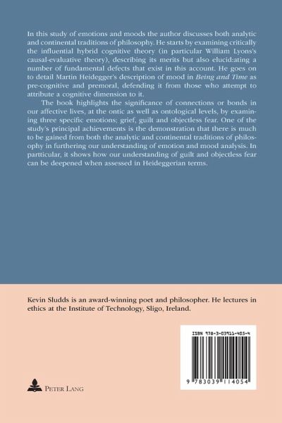 In this study of emotions and moods the author discusses both analytic and continental traditions of philosophy. He starts by examining critically the influential hybrid cognitive theory (in particular William Lyons's causal-evaluative theory), describing its merits but also elucidating a number of fundamental defects that exist in this account. He goes on to detail Martin Heidegger's description of mood in Being and Time as pre-cognitive and pre-moral, defending it from those who attempt to attribute a cognitive dimension to it.