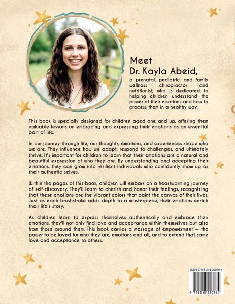 Meet Dr. Kayla Abeid, a prenatal, pediatric, and family wellness chiropractor and nutritionist, who is dedicated to helping children understand the power of their emotions and how to process them in a healthy way. This book is specially designed for children aged one and up, offering them valuable lessons on embracing and expressing their emotions as an essential part of life. In our journey through life, our thoughts, emotions, and experiences shape who we are. They influence how we adapt, respond to challenges, and ultimately thrive. It's important for children to learn that their emotions are a natural and beautiful expression of who they are. By understanding and accepting their emotions, they can grow into resilient individuals who confidently show up as their authentic selves. Within the pages of this book, children will embark on a heartwarming journey of self-discovery. They'll learn to cherish and honor their feelings, recognizing that these emotions are the vibrant colors that paint the canvas of their lives. Just as each brushstroke adds depth to a masterpiece, their emotions enrich their life's story. As children learn to express themselves authentically and embrace their emotions, they'll not only find love and acceptance within themselves but also from those around them. This book carries a message of empowerment - the power to be loved for who they are, emotions and all, and to extend that same love and acceptance to others.