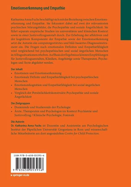 Katharina Anna Fuchs beschäftigt sich mit der Beziehung zwischen Emotionserkennung und Empathie. Sie fokussiert dabei auf zwei der relevantesten psychischen Störungsbilder, die Psychopathie und soziale Ängstlichkeit. Sie führt separate empirische Studien im universitären und klinischen Kontext sowie in einer Justizvollzugsanstalt durch. Zur Erhebung der affektiven und der kognitiven Komponente der Empathie sowie der Emotionserkennung setzt die Autorin ein computergestütztes und bild-basiertes Diagnoseinstrument ein. Die Fragen nach emotionalen Defiziten und Empathiefähigkeit wird vergleichend bei psychopathischen und sozial ängstlichen Menschen in Alltagssituationen erhoben. Auf Basis der Ergebnisse können Empfehlungen für Justizvollzugsanstalten, Kliniken, Angehörige sowie Therapeuten, Psychologen und Ärzte abgeleitet werden.