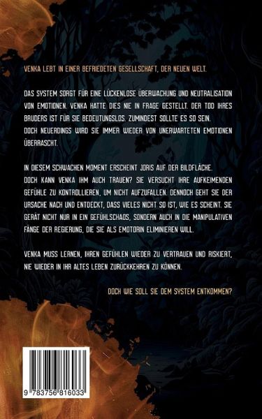 Venka lebt in einer befriedeten Gesellschaft, der Neuen Welt. Das System sorgt für eine lückenlose Überwachung und Neutralisation von Emotionen.Venka hatte dies nie in Frage gestellt. Der Tod ihres Bruders ist für sie bedeutungslos. Zumindest sollte es so sein. Doch neuerdings wird sie immer wieder von unerwarteten Emotionen überrascht. In diesem schwachen Moment erscheint Joris auf der Bildfläche, doch kann Venka ihm auch trauen?Sie versucht ihre aufkeimenden Gefühle zu kontrollieren, um nicht aufzufallen.Dennoch geht sie der Ursache nach und entdeckt, dass Vieles nicht so ist, wie es scheint. Sie gerät nicht nur in ein Gefühlschaos, sondern auch in die manipulativen Fänge der Regierung, die sie als Emotorin eliminieren will. Venka muss lernen, ihren Gefühlen wieder zu vertrauen und riskiert, nie wieder in ihr altes Leben zurückkehren zu können.Doch wie soll sie dem System entkommen?