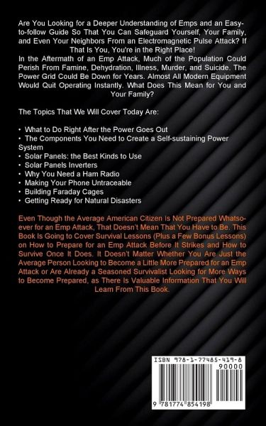 Are You Looking for a Deeper Understanding of Emps and an Easy-to-follow Guide So That You Can Safeguard Yourself, Your Family, and Even Your Neighbors From an Electromagnetic Pulse Attack? If That Is You, You're in the Right Place!In the Aftermath of an Emp Attack, Much of the Population Could Perish From Famine, Dehydration, Illness, Murder, and Suicide. The Power Grid Could Be Down for Years. Almost All Modern Equipment Would Quit Operating Instantly. What Does This Mean for You and Your Family? The Topics That We Will Cover Today Are: · What to Do Right After the Power Goes Out· The Components You Need to Create a Self-sustaining Power System· Solar Panels: the Best Kinds to Use· Solar Panels Inverters· Why You Need a Ham Radio· Making Your Phone Untraceable· Building Faraday Cages· Getting Ready for Natural Disasters Even Though the Average American Citizen Is Not Prepared Whatsoever for an Emp Attack, That Doesn't Mean That You Have to Be. This Book Is Going to Cover Survival Lessons (Plus a Few Bonus Lessons) on How to Prepare for an Emp Attack Before It Strikes and How to Survive Once It Does. It Doesn't Matter Whether You Are Just the Average Person Looking to Become a Little More Prepared for an Emp Attack or Are Already a Seasoned Survivalist Looking for More Ways to Become Prepared, as There Is Valuable Information That You Will Learn From This Book.