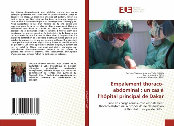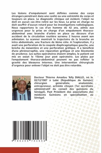 Les lésions d'empalement sont définies comme des corps étrangers pénétrant dans une cavité ou une extrémité du corps et toujours en place. Le diagnostic clinique est évident, l'objet ne doit en aucun cas être retiré sur les lieux. La prise en charge ne doit souffrir d'aucun retard pour les investigations radiologiques. Nous rapportons le cas d'un homme de 42 ans, admis aux urgences pour la prise en charge d'un empalement thoraco-abdominal avec branche d'arbre en place au décours d'un accident de la circulation routière survenu 2 heures avant son admission. Le scanner montrait la trajectoire de la branche en intra abdominale, une fracture de 6ème côte. A l'exploration, il y avait une perforation de la coupole diaphragmatique gauche, une brèche du mésentère et une perforation grêlique. Il a bénéficié d'une phrénorraphie, une réparation grêlique et une iléostomie de prudence. Les suites opératoires étaient simples, le patient est mis en exéat le 15ème jour post opératoire. Les plaies par l'empalement thoraco-abdominal peuvent ne pas refléter la gravité des blessures internes. Une intervention chirurgicale d'urgence pour enlever l'objet ne doit pas être retardée.