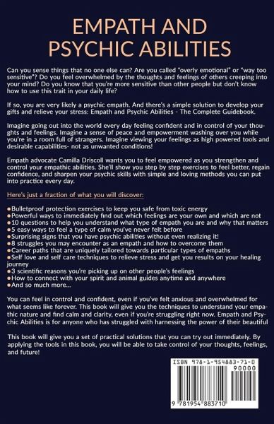 Can you sense things that no one else can? Are you called "overly emotional" or "way too sensitive"? Do you feel overwhelmed by the thoughts and feelings of others creeping into your mind? If so, you are very likely a psychic empath. And there's a simple solution to develop your gifts and relieve your stress: Empath and Psychic Abilities - The Complete Guidebook. Imagine going out into the world every day feeling confident and in control of your thoughts and feelings. Imagine viewing your feelings as high powered tools and desirable capabilities- not as unwanted conditions! Empath advocate Camilla Driscoll wants you to feel empowered as you strengthen and control your empathic abilities. She'll show you step by step exercises to feel better, regain confidence, and sharpen your psychic skills with simple and loving methods you can put into practice every day. Here's just a fraction of what you will discover:Bulletproof protection exercises to keep you safe from toxic energy Powerful ways to immediately find out which feelings are your own and which are not 10 questions to help you understand what type of empath you are and why that matters 5 easy ways to feel a type of calm you've never felt before Surprising signs that you have psychic abilities without even realizing it! 8 struggles you may encounter as an empath and how to overcome them 3 scientific reasons you're picking up on other people's feelings How to connect with your spirit and animal guides anytime and anywhere And so much more... You can feel in control and confident, even if you've felt anxious and overwhelmed for what seems like forever. This book will give you the techniques to understand your empathic nature and find calm and clarity, even if you're struggling right now. Don't wait a moment longer to have clarity in your life - get your copy of Empath and Psychic Abilities today!