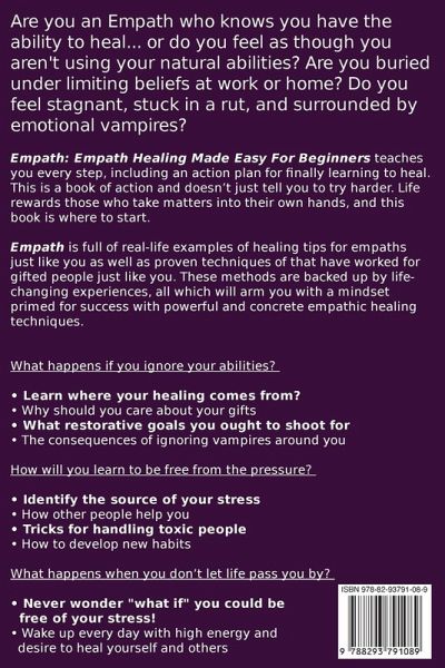 Are you an Empath who knows you have the ability to heal... or do you feel as though you aren't using your natural abilities? Are you buried under limiting beliefs at work or home? Do you feel stagnant, stuck in a rut, and surrounded by emotional vampires? Are you terrified of wasting your life without unlocking your natural healing ability? If you keep doing what you've always done, you'll never learn to heal yourself and the world around you. Is this positive for you? Empath: Empath Healing Made Easy For Beginners teaches you every step, including an action plan for finally learning to heal. This is a book of action and doesn't just tell you to try harder. Life rewards those who take matters into their own hands, and this book is where to start. Empath is full of real-life examples of healing tips for empaths just like you as well as proven techniques of that have worked for gifted people just like you. These methods are backed up by life-changing experiences, all which will arm you with a mindset primed for success with powerful and concrete empathic healing techniques. Easy-to-implement small changes and practical takeaways for immediate action. What happens if you ignore your abilities? • Learn where your healing comes from? • Why should you care about your gifts • What restorative goals you ought to shoot for • The consequences of ignoring vampires around you How will you learn to be free from the pressure? • Identify the source of your stress • How other people help you • Tricks for handling toxic people • How to develop new habits What happens when you don't let life pass you by? • Never wonder "what if" you could be free of your stress! • Wake up every day with high energy and desire to heal yourself and others • Inspire yourself and others to create the life they want. • Feel comfortable with your identity. Find out how to open up your gifts and take flight towards the empathic life of your dreams, period. Create the life and peace you want. Try Empath: Empath Healing Made Easy For Beginners today by clicking the BUY NOW button at the top right of this page! P.S. You'll be able to notice a healthy difference within 24 hours.
