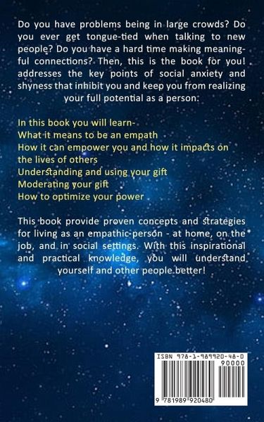 Do you have problems being in large crowds? Do you ever get tongue-tied when talking to new people? Do you have a hard time making meaningful connections? Then, this is the book for you! addresses the key points of social anxiety and shyness that inhibit you and keep you from realizing your full potential as a person. Each in-depth chapter concentrates on an aspect of being an empath What it means to be an empath How it can empower you and how it impacts on the lives of others Understanding and using your gift Moderating your gift How to optimize your powerThis book provide proven concepts and strategies for living as an empathic person - at home, on the job, and in social settings. With this inspirational and practical knowledge, you will understand yourself and other people better!