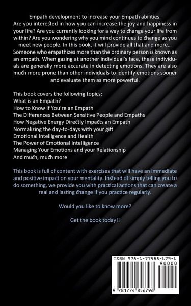 Empath development to increase your Empath abilities. Are you interested in how you can increase the joy and happiness in your life? Are you currently looking for a way to change your life from within? Are you wondering why you mind continues to change as you meet new people. In this book, it will provide all that and more... Someone who empathizes more than the ordinary person is known as an empath. When gazing at another individual's face, these individuals are generally more accurate in detecting emotions. They are also much more prone than other individuals to identify emotions sooner and evaluate them as more powerful. This book covers the following topics:What is an Empath? How to Know If You're an Empath The Differences Between Sensitive People and Empaths How Negative Energy Directly Impacts an Empath Normalizing the day-to-days with your gift Emotional Intelligence and Health The Power of Emotional Intelligence Managing Your Emotions and your Relationship And much, much more This book is full of content with exercises that will have an immediate and positive impact on your mentality. Instead of simply telling you to do something, we provide you with practical actions that can create a real and lasting change if you practice regularly. Would you like to know more? Get the book today!!