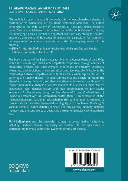 This book is a study of the Berlin Holocaust Memorial Competitions of the 1990s, with a focus on designs that kindle empathetic responses. Through analysis of provocative designs, the book engages with issues of empathy, secondary witnessing, and depictions of concentration camp iconography. It explores the relationship between empathy and cultural memory when representations of suffering are notably absent. The book submits that one design represents the idea of an uncanny memorial, and also pays attention to viewer co-authorship in counter-monuments. Analysis of counter-monuments also include their creative engagement with German history and their determination to defy fascist aesthetics. As the winning design for The Memorial to the Murdered Jews of Europe is abstract with an information centre, there is an exploration of the memorial museum. Callaghan asks whether this configuration is intended to compensate for the abstract memorial's ambiguity or to complement the design's visceral potential. Other debates explored concern political memory, national memory, and the controversy of dedicating the memorial exclusively to murdered Jews.