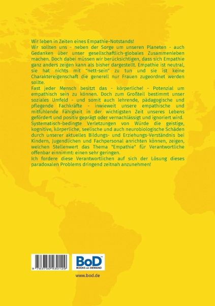 Wir leben in Zeiten eines Empathie-Notstands!Wir sollten uns - neben der Sorge um unseren Planeten - auch Gedanken über unser gesellschaftlich-globales Zusammenleben machen. Doch dabei müssen wir berücksichtigen, dass sich Empathie ganz anders zeigen kann, als wir das bisher gewohnt sind. Empathie ist neutral, sie hat nichts mit "Nett-Sein" zu tun, und sie ist keine Charaktereigenschaft, die generell nur auf Frauen zutrifft. Fast jeder Mensch besitzt das - körperliche! - Potenzial, um empathisch sein zu können. Doch zum Großteil bestimmt unser soziales Umfeld - und somit auch lehrende, pädagogische und pflegende Fachkräfte - inwieweit unsere empathische und mitfühlende Fähigkeit am Anfang unseres Lebens gefördert und positiv geprägt oder vernachlässigt und ignoriert wird. Systematisch bedingte Verletzungen unserer Würde, die geistige, kognitive, körperliche, seelische und auch neurobiologische Schäden durch unserer aktuelles Bildungs- und Erziehungs-Verständnis bei Kindern, Jugendlichen und Fachpersonal anrichten können, zeigen, welchen Stellenwert das Thema "Empathie" für Verantwortliche offenbar einnimmt: einen sehr geringen.Mein Appell an diejenigen, die im Bereich Erziehung etwas zu entscheiden haben: Nehmen Sie sich dieser fundamentalen Angelegenheit dringend zeitnah an! Eine Analyse der Problemlage sowie mögliche Lösungswege finden Sie in meinem Buch.