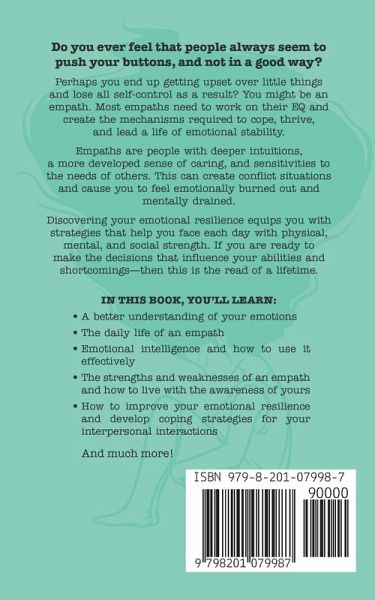 Do you ever feel that people always seem to push your buttons, and not in a good way? Perhaps you end up getting upset over little things and lose all self-control as a result? You might be an empath. Most empaths need to work on their EQ and create the mechanisms required to cope, thrive, and lead a life of emotional stability. Relationships can be tricky when your personality and emotional affinity affects friends, family, and colleagues. There is a better way to interact with those around you without unbottling your emotional genie at every turn. Empaths are people with deeper intuitions, a more developed sense of caring, and sensitivities to the needs of others. This can create conflict situations and cause you to feel emotionally burned out and mentally drained. Only one to two percent of people are empaths, and they exhibit their empathy and emotional intelligence in unique ways. Discovering your emotional resilience equips you with strategies that help you face each day with physical, mental, and social strength. If you are ready to make the decisions that influence your abilities and shortcomings-then this is the read of a lifetime. Learning how to participate in and handle social interactions is one of the most challenging tasks for empaths as their emotional radars are always on maximum; however, it can be done. Whether you simply seek to improve and define your relationships with others or work on your relationship with yourself, this book is for you. Inside this book, unlock: 1.) A better understanding of your emotions 2.) The daily life of an empath 3.) Emotional intelligence and how to use it effectively 4.) The strengths and weaknesses of an empath and how to live with the awareness of yours 5.) How to improve your emotional resilience and develop coping strategies for your interpersonal interactions and much more! Become mentally strong, make better decisions, and react in appropriate ways without wasting energy or losing control. Being an emotionally mature empath makes for a great companion. Having a free spirit and being truth driven means you will be able to live in every life situation with authenticity and clarity. You can reduce your confusion, feel with more certainty, and enjoy each moment without compromising who you are. Knowing which careers suit your emotional awareness can help you trust your choices, create growth opportunities, and stay positive in life.