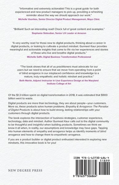 Of the $1.3 trillion spent on digital transformation in 2018, it was estimated that $900 billion went to waste. Digital products are more than technology, they are about people-your customers. More so, these products solve human problems. Empathy & Arrogance: The Paradox of Digital Products is about how to build strong, lasting relationships with your customers through digital products. The book explores the intersection of business strategies, customer experience, technology, data and mindset. Author Gurmeet Kaur calls out to the digital community to be thoughtful and insightful when building products. Sometimes we think we know it all when, in reality, our assumptions and knowledge may have gaps. Tapping into human elements of empathy and arrogance helps us identify moments of blind arrogance and how to change them to empathetic arrogance. If you are a product builder or digital product enthusiast interested in exploring new mindsets, this innovative book is for you!