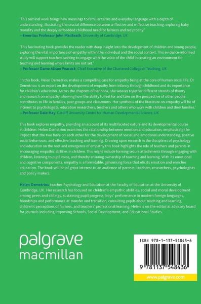 This book explores the construct of empathy and its connection with education. Charting literature on the origins and evolution of the concept of empathy, the author examines the multifaceted nature of empathy and the external and internal influences behind this concept. The relationship between empathy and education is examined through the impact they have on each other for the development of social and emotional understanding, positive social behaviours and effective teaching and learning. In doing so, the author emphasises that empathy apparent in the early years of life is invaluable for enhancing the quality of teaching and learning in future, and should be elicited from pupils and teachers alike. This book will be of interest to practitioners, educational psychologists, and researchers in empathy and its effect on education.