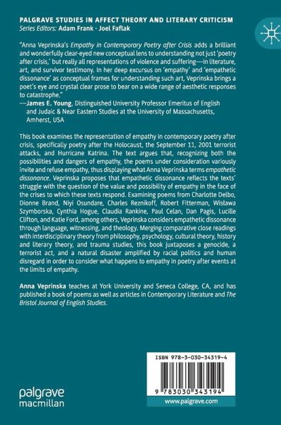 This book examines the representation of empathy in contemporary poetry after crisis, specifically poetry after the Holocaust, the September 11, 2001 terrorist attacks, and Hurricane Katrina. The text argues that, recognizing both the possibilities and dangers of empathy, the poems under consideration variously invite and refuse empathy, thus displaying what Anna Veprinska terms empathetic dissonance. Veprinska proposes that empathetic dissonance reflects the texts' struggle with the question of the value and possibility of empathy in the face of the crises to which these texts respond. Examining poems from Charlotte Delbo, Dionne Brand, Niyi Osundare, Charles Reznikoff, Robert Fitterman, Wislawa Szymborska, Cynthia Hogue, Claudia Rankine, Paul Celan, Dan Pagis, Lucille Clifton, and Katie Ford, among others, Veprinska considers empathetic dissonance through language, witnessing, and theology. Merging comparative close readings with interdisciplinary theory from philosophy, psychology, cultural theory, history and literary theory, and trauma studies, this book juxtaposes a genocide, a terrorist act, and a natural disaster amplified by racial politics and human disregard in order to consider what happens to empathy in poetry after events at the limits of empathy.