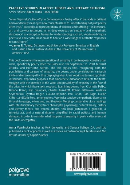This book examines the representation of empathy in contemporary poetry after crisis, specifically poetry after the Holocaust, the September 11, 2001 terrorist attacks, and Hurricane Katrina. The text argues that, recognizing both the possibilities and dangers of empathy, the poems under consideration variously invite and refuse empathy, thus displaying what Anna Veprinska terms empathetic dissonance. Veprinska proposes that empathetic dissonance reflects the texts' struggle with the question of the value and possibility of empathy in the face of the crises to which these texts respond. Examining poems from Charlotte Delbo, Dionne Brand, Niyi Osundare, Charles Reznikoff, Robert Fitterman, Wislawa Szymborska, Cynthia Hogue, Claudia Rankine, Paul Celan, Dan Pagis, Lucille Clifton, and Katie Ford, among others, Veprinska considers empathetic dissonance through language, witnessing, and theology. Merging comparative close readings with interdisciplinary theory from philosophy, psychology, cultural theory, history and literary theory, and trauma studies, this book juxtaposes a genocide, a terrorist act, and a natural disaster amplified by racial politics and human disregard in order to consider what happens to empathy in poetry after events at the limits of empathy.