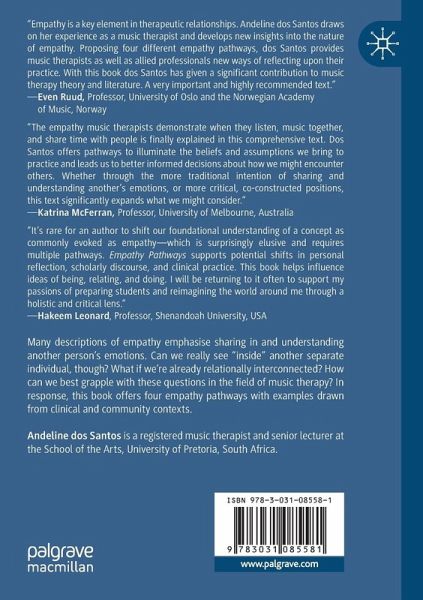 Many descriptions of empathy revolve around sharing in and understanding another person's emotions. One separate person gains access to the emotional world of another. An entire worldview holds up this idea. It is individualistic and affirms the possibility of access to other people's "inner world." Can we really see inside another, though? And are we discrete, separate selves? How can we best grapple with these questions in the field of music therapy? In response, this book offers four empathy pathways. Two are situated in a constituent approach (that prioritises discrete individuals who then enter into relationships with one another) and two are located in relational approaches (that acknowledge the foundational reality of relationships themselves). By understanding empathy more fully, music therapists, teachers and researchers can engage in ways that are congruent with diverse worldviews and ways of being. Examples used in the book are from active and receptive music therapyapproaches as well as from community and clinical contexts, so as to provide clear links to practice.