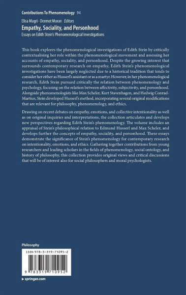 Part 1. Stein, Husserl and the Early Phenomenological Movement.- 1. (Hans Reiner Sepp).- 2. (Thomas Nenon).- 3. The Dualism of the I. A Commentary on Hedwig Conrad-Martius's Realist Phenomenology.- Part II. Empathy and Affectivity.- 4. The Chiasm of Empathy (Elisa Magri).- 5. Stein on Emotion and Value (Ingrid Vendrell Ferran).- 6. Empathy and Anti-Empathy: Which are the Problems? (Michela Summa).- Part III. Personhood and Community.- 7. Being (as) a Person: Ontological Status and Phenomenological Basis of 'Personsein' in Edith Stein's Philosophical Work (Jean-François Lavigne).- 8. Empathy and Community in Edith Stein's Phenomenology (Timothy Burns).- 9. The Role of Identification in Experiencing Community: Edith Stein, Empathy and Max Scheler (Antonio Calcagno).- 10. The Phenomenological Approach to Collective Intentionality: Edith Stein and Kurt Stavenhagen (Alessandro Salice).- Part IV. Empathy and Medical Ethics.- 11. Stein's Understanding of Mental Health and Mental Illness (Mette Lebech).- 12. Edith Stein's Phenomenology of Empathy and Medical Ethics (Fredrik Svenaeus).