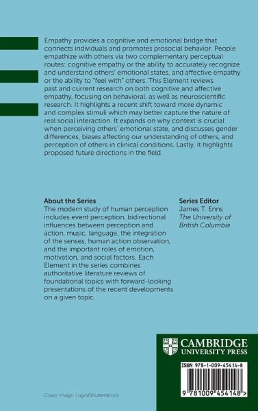 This Element reviews research on cognitive and affective empathy and highlights a recent shift towards more dynamic and complex stimuli which may capture better the nature of real social interaction. It also emphasizes context, gender differences, biases, and perception of others in clinical conditions.