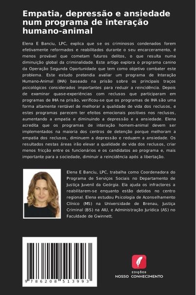 Elena E Banciu, LPC, explica que se os criminosos condenados forem efetivamente reformados e reabilitados durante o seu encarceramento, é menos provável que cometam futuros delitos, o que resulta numa diminuição global da criminalidade. Este artigo explora o programa canino da Operação Segunda Oportunidade que tem como objetivo combater este problema. Este estudo pretendia avaliar um programa de Interação Humano-Animal (IHA) baseado na prisão sobre os principais traços psicológicos considerados importantes para reduzir a reincidência. Depois de examinar quase-experiências com reclusos que participaram em programas de IHA na prisão, verificou-se que os programas de IHA são uma forma altamente rentável de melhorar a qualidade de vida dos reclusos, e estes programas parecem ter efeitos emocionais positivos nos reclusos, aumentando a empatia e diminuindo a depressão e a ansiedade. Elena acredita que os programas de interação homem-animal devem ser implementados na maioria dos centros de detenção porque melhoram a empatia dos reclusos, diminuem a depressão e reduzem a ansiedade. Os resultados nestas áreas irão elevar a qualidade de vida dos reclusos, criar menos fricção entre os funcionários e os candidatos ao programa e, mais importante para a sociedade, diminuir a reincidência após a libertação.
