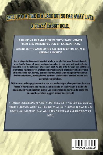Once upon a time in a land not so far away, lived a crazy rabbit hole.A gripping drama riddled with dark humor, from the insightful pen of Carson Haze.Setting out to answer the age-old question, what is normal anyway?Our protagonist is one cold hearted witch, or so she has been deemed. Proudly wearing the badge of honor bestowed upon her by her exes and family, she is forced to face the echoes of a turbulent past. As she sifts through her childhood memories, humorous yet profound interactions with characters like Gary and Mitchell shape her journey. Each encounter, laden with manipulative and ego-driven undertones, forcing her to confront the façade of societal norms and personal relationships.With every challenging interaction and societal critique, she questions the very fabric of her beliefs and values. As she stands on the brink of a major life decision; only one question looms. Can she overcome her past to bring the answer before her biggest secret is exposed?If tales of overcoming adversity, emotional depth and critical societal insights resonates with you, then you will find a powerful ally in this compelling narrative that will touch your heart and provoke your mind.