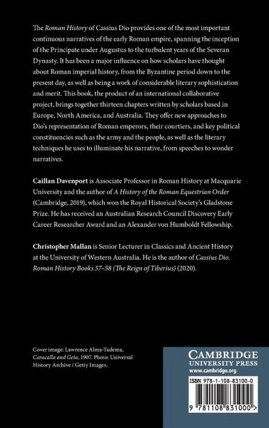 Introduction: Cassius Dio: The Senator and his Caesars Caillan Davenport and Christopher Mallan; Part I. Imperial and Political Narratives: 1. Vox Populi, Vox Mea? Information, Evaluation and Public Opinion in Dio's Account of the Principate Adam Kemezis; 2. News, Rumour, and the Political Culture of the Roman Imperial Monarchy in the Roman History Caillan Davenport; 3. Literary and Documentary Sources in Dio's Narrative of the Roman Emperors Cesare Letta; 4. 'Now Comes the Greatest Marvel of All!' (79[78].8.2): Dio's Roman Emperors and the Incredible Rhiannon Ash; Part II. Emperors and Biographies: 5. Cassius Dio's Funeral Speech for Augustus: Sources, Rhetoric, Messages Christina T. Kuhn; 6. '... but he possessed a most singular nature': Cassius Dio on Tiberius Christopher Mallan; 7. An Emperor's War on Greece: Cassius Dio's Nero Shushma Malik; 8. War and Peace: Imperial Leadership in Dio's Second-Century Narrative Caillan Davenport; III. Political Groups and Political Culture: 9. 'The People' and Cassius Dio Monica Hellström; 10. Citizenship, Enfranchisement, and Honour in Cassius Dio Myles Lavan; 11. The Company They Keep: Emperors and their Associates Barbara Saylor Rodgers; 12. Dio and his Friends: Autobiography and Biography in Dio's Contemporary Narrative Christopher Mallan; IV. Reception and Reflection: 13. The Reception of Cassius Dio's Imperial Narrative in Byzantium (Tenth - Twelfth Centuries) Alicia Simpson.