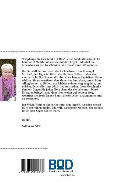 "Empfange die Geschenke Gottes" ist ein Meditationsbuch. Es beinhaltet Meditationsreisen mit den Engeln und führt die Menschen zu den Geschenken, die direkt von Gott kommen.Der Kristall der Weisheit, das Lichtschwert von Erzengel Michael, der Tiger im Geist, die Flamme Gottes, ... dies sind energetische Geschenke, die ein Leben lang auf geistiger Ebene wirken. Sie unterstützen den Menschen im Leben, um sich im Alltag besser zu fühlen, um leichter seinen Weg zu gehen, um stärker, liebevoller und göttlicher zu werden. Diese Geschenke sind ein Segen für jeden Menschen, der sie bekommt. Diese Energien bringen den Menschen weiter auf seinem Weg, wodurch die Seele lernen kann, dieses Leben anzunehmen und zu verstehen.Ich, Sylvia Wander, danke Gott und den Engeln, dass ich dieses Buch schreiben durfte. Ich weiß, dass jeder Mensch, der es liest, unter dem Segen Gottes steht.Danke,Sylvia Wander