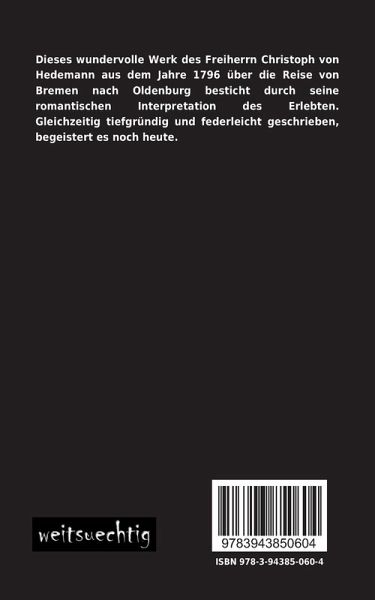 Dieses wundervolle Werk des Freiherrn Christoph von Hedemann aus dem Jahre 1796 über die Reise von Bremen nach Oldenburg besticht durch seine romantischen Interpretation des Erlebten. Gleichzeitig tiefgründig und federleicht geschrieben, begeistert es noch heute.