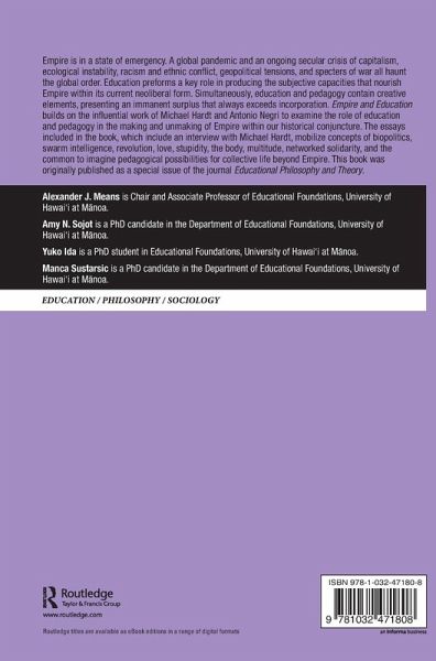 Introduction-Empire and education 1. Education after empire: A biopolitical analytics of capital, nation, and identity 2. A dialogue with Michael Hardt on revolution, joy, and learning to let go 3. Educational realism: Defining exopedagogy as the choreography of swarm intelligence 4. Critical pedagogy beyond the multitude: Decolonizing Hardt and Negri 5. Emotional fundamentalism and education of the body 6. The multitude beyond measure: Building a common stupor 7. Solidarity with nonhumans as an ontological struggle 8. Logics of rule and the politics of exodus: Twenty years of Empire 9. The biopolitical turn in educational theory: Autonomist Marxism and revolutionary subjectivity in Empire 10. Postscript on the empire of control