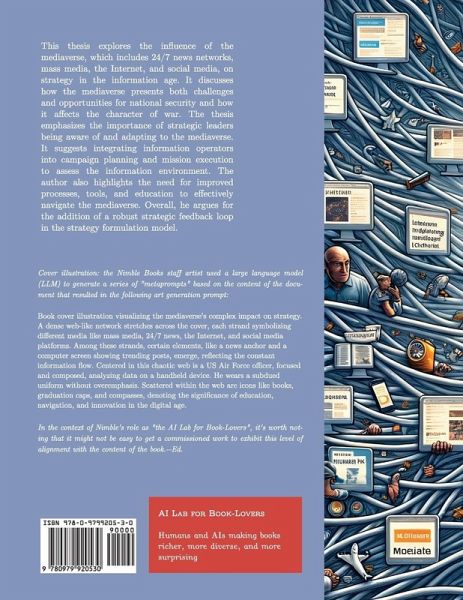 This "strategic research project" for a 2013 master's thesis at the US Army War College by US Air Force Lt. Colonel Christopher Lohr continues to be timely both for its insights and for what it reveals about US military thinking. From the author's abstract: The proliferation of mobile Internet technology grants the average global citizen immediate access to information and the ability to posit opinions, i.e. influence, at near-real-time speed. The amalgam of 247 news networks, mass media, the Internet, and social media the mediaverse, coupled with mobile technology, influences strategy in three ways. First, it is a national security challenge and opportunity. Second, it influences the character of war. Third, it is forcing an evolution of the strategic environment. The successful strategic leader must be not just aware but au courant on the challenges and opportunities presented by the mediaverse. Improved processes, tools, and education are required to adapt to mediaverse influencers. The most significant systemic improvement is the addition of a robust strategic feedback loop in the strategy formulation model. This can be accomplished by better integrating information operators into campaign planning and mission execution to surveil the mediaverse to assess content and on-going events to provide a robust assessment of the information environment. Formal developmental education should expand current media training to include skillful reconnaissance of, and engagement in, the mediaverse. This forty-page thesis is enhanced by AI analytical tools including five kinds of summaries; four introductory essays to provide viewpoint diversity; a page-by-page summary; and a table of notable passages. Cover illustration: the Nimble Books staff artist used a large language model (LLM) to generate a series of "metaprompts" based on the content of the document that resulted in the followiung art generation prompt: Book cover illustration visualizing the mediaverse's complex impact on strategy. A dense web-like network stretches across the cover, each strand symbolizing different media like mass media, 24/7 news, the Internet, and social media platforms. Among these strands, certain elements, like a news anchor and a computer screen showing trending posts, emerge, reflecting the constant information flow. Centered in this chaotic web is a US Air Force officer, focused and composed, analyzing data on a handheld device. He wears a subdued uniform without overemphasis. Scattered within the web are icons like books, graduation caps, and compasses, denoting the significance of education, navigation, and innovation in the digital age. In the context of Nimble's role as "the AI Lab for Book-Lovers", it's worth noting that it might not be easy to get a commissioned work to exhibit this level of alignment with the content of the book.--Ed.