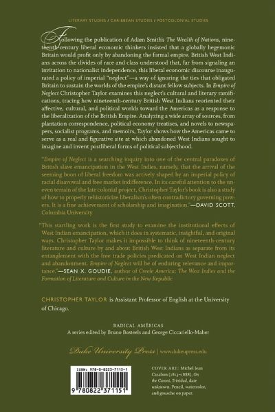 Following the publication of Adam Smith's The Wealth of Nations, nineteenth-century liberal economic thinkers insisted that a globally hegemonic Britain would profit only by abandoning the formal empire. British West Indians across the divides of race and class understood that, far from signaling an invitation to nationalist independence, this liberal economic discourse inaugurated a policy of imperial "neglect"-a way of ignoring the ties that obligated Britain to sustain the worlds of the empire's distant fellow subjects. In Empire of Neglect Christopher Taylor examines this neglect's cultural and literary ramifications, tracing how nineteenth-century British West Indians reoriented their affective, cultural, and political worlds toward the Americas as a response to the liberalization of the British Empire. Analyzing a wide array of sources, from plantation correspondence, political economy treatises, and novels to newspapers, socialist programs, and memoirs, Taylor shows how the Americas came to serve as a real and figurative site at which abandoned West Indians sought to imagine and invent postliberal forms of political subjecthood.