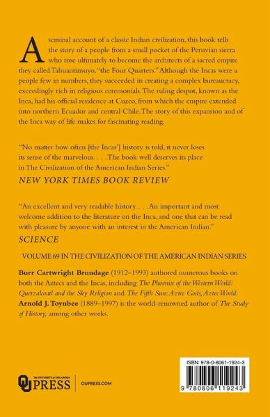 A great account of a classic Indian civilization, this book tells the story of a people who, hatched in a small pocket of the Peruvian sierra, rose in the end to become the architects and chief beneficiaries of an empire they called Tahuantinsuyo, the Four Quarters. Tahuantinsuyo, with Cuzco as its highly respected seat of government and the official residence of the ruling Inca, was a sacred empire. Its territorial aggrandizement was a function of its religious mission, while, reciprocally, its thirst for power dictated what were to be the lineaments of its most holy beliefs. When the sense of divine mission began to fail, the empire incontinently collapsed. But the history of the Inca Empire was more than just a prelude to the Spanish conquest under Francisco Pizarro in 1532. The swift creation of the remarkable state is important in that it is in no way related to the traditions of the European and Asiatic empires. Further, even though the Incas were a people few in numbers, they succeeded in creating a highly bureaucratic organization exceedingly rich in religious ceremonialism. The Incas, dwelling in the highlands of modern Peru, were consolidated by Manco Capac perhaps as early as the eleventh century. Under the rule of a despotic head, known as the Inca, the empire was expanded by Pachacuti, Topa Inca, Huayna Capac, and others up to Atahualpa, until it extended from northern Ecuador to central Chile. The story of this expansion and the description of all the Incas' life, from their religious beliefs and rituals to a discussion of their engineering prowess in their still-existent Royal Road, is fascinating reading. Burr Cartwright Brundage, Professor of History Emeritus in Eckerd College, Saint Petersburg, Florida, is the author of many books on Mesoamerica, including Empire of the Inca and Phoenix of the Western World: Quetzalcoatl and the Sky Religion, also published by the University of Oklahoma Press.