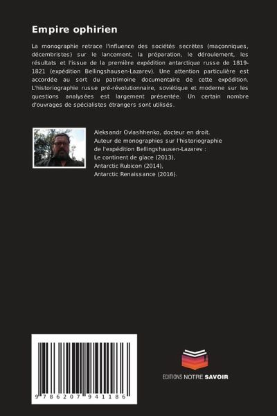 La monographie retrace l'influence des sociétés secrètes (maçonniques, décembristes) sur le lancement, la préparation, le déroulement, les résultats et l'issue de la première expédition antarctique russe de 1819-1821 (expédition Bellingshausen-Lazarev). Une attention particulière est accordée au sort du patrimoine documentaire de cette expédition. L'historiographie russe pré-révolutionnaire, soviétique et moderne sur les questions analysées est largement présentée. Un certain nombre d'ouvrages de spécialistes étrangers sont utilisés.