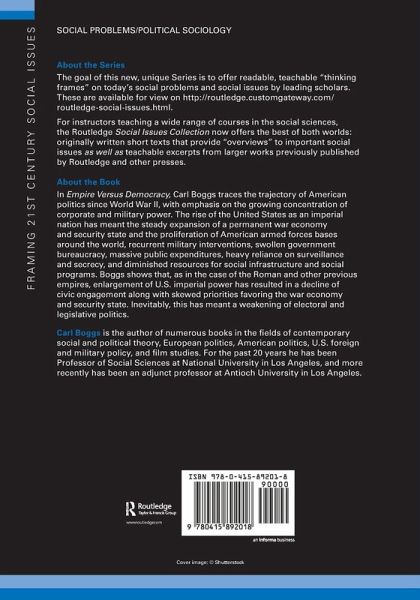 In Empire Versus Democracy, Carl Boggs traces the authoritarian trajectory of American politics since World War II, with emphasis on the growing concentration of corporate and military power that has accompanied the United States assumption of leading superpower on the world scene. The rise of the U.S. as unchallenged imperial nation has meant the steady expansion of a permanent war economy and security state that, working in tandem with large business interests, has led to proliferation of American armed-forces bases around the world, recurrent military interventions, swollen government bureaucracy, massive public expenditures, heavy reliance on surveillance and secrecy, and diminished resources for social infrastructure and social programs. Boggs shows that, as in the case of the Roman and other previous empires, enlargement of U.S. imperial power has resulted in a decline of civic engagement and local participation along with skewed priorities favoring the war economy and security state. Inevitably, this has meant a weakening of electoral and legislative politics, overwhelmed by the centers of enormous wealth and power. The goal of this new, unique Series is to offer readable, teachable "thinking frames" on today's social problems and social issues by leading scholars, all in short 60 page or shorter formats, and available for view on http://routledge.customgateway.com/routledge-social-issues.html For instructors teaching a wide range of courses in the social sciences, the Routledge Social Issues Collection now offers the best of both worlds: originally written short texts that provide "overviews" to important social issues as well as teachable excerpts from larger works previously published by Routledge and other presses.