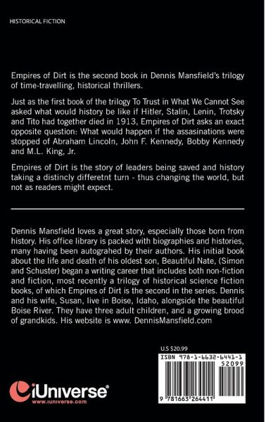Empires of Dirt is the second book in Dennis Mansfield's trilogy of time-travelling, historical thrillers. Just as the first book of the trilogy To Trust in What We Cannot See asked what would history be like if Hitler, Stalin, Lenin, Trotsky and Tito had together died in 1913, Empires of Dirt asks an exact opposite question: What would happen if the assasinations were stopped of Abraham Lincoln, John F. Kennedy, Bobby Kennedy and M.L. King, Jr. Empires of Dirt is the story of leaders being saved and history taking a distincly differetnt turn - thus changing the world, but not as readers might expect.