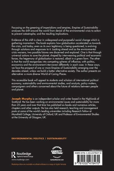 Evidence of this shift is clear in widespread and purposeful social change which is gathering momentum. The book explains how globalisation accelerated us towards the crisis, and today, even as its own legitimacy is being questioned, is evolving through solutions and responses to it. Looking ahead and as the environmental crisis worsens, two possible futures are discerned and explored. One is that through universal actions to save the planet, shaped by interweaving political and economic forces, the hegemony of globalisation is restored, albeit in a green form. The other is that the world reorganises into competing spheres of influence, with politics, economics and the environment interwoven differently in each case. In these ways, we face the prospect of one or more Empires of Sustainability emerging over the decades ahead, unless we build a better alternative society. The author presents an alternative: a more diverse World of Caring Places.