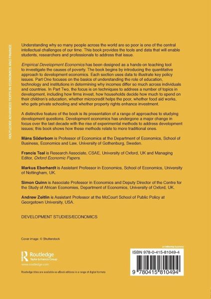 Empirical Development Economics has been designed as a hands-on teaching tool to investigate the causes of poverty. The book begins by introducing the quantitative approach to development economics. Each section uses data to illustrate key policy issues. Part One focuses on the basics of understanding the role of education, technology and institutions in determining why incomes differ so much across individuals and countries. In Part Two, the focus is on techniques to address a number of topics in development, including how firms invest, how households decide how much to spend on their children's education, whether microcredit helps the poor, whether food aid works, who gets private schooling and whether property rights enhance investment.