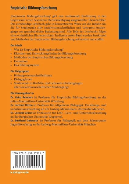 Was ist Empirische Bildungsforschung?.- Klassiker und Entwicklungslinien der Bildungsforschung.- Methoden der Empirischen Bildungsforschung.- Evaluation.- Das Bildungssystem.