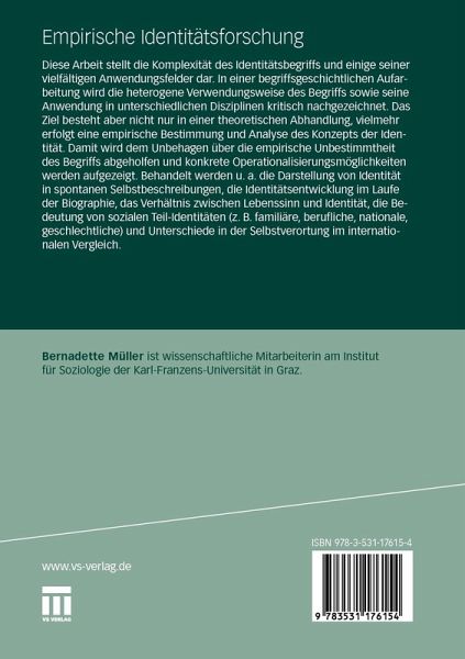 Diese Arbeit stellt die Komplexität des Identitätsbegriffs und einige seiner vielfältigen Anwendungsfelder dar. In einer begriffsgeschichtlichen Aufarbeitung wird die heterogene Verwendungsweise des Begriffs sowie seine Anwendung in unterschiedlichen Disziplinen kritisch nachgezeichnet. Das Ziel besteht aber nicht nur in einer theoretischen Abhandlung, vielmehr erfolgt eine empirische Bestimmung und Analyse des Konzepts der Identität. Damit wird dem Unbehagen über die empirische Unbestimmtheit des Begriffs abgeholfen und konkrete Operationalisierungsmöglichkeiten werden aufgezeigt. Behandelt werden u. a. die Darstellung von Identität in spontanen Selbstbeschreibungen, die Identitätsentwicklung im Laufe der Biographie, das Verhältnis zwischen Lebenssinn und Identität, die Bedeutung von sozialen Teil-Identitäten (z. B. familiäre, berufliche, nationale, geschlechtliche) und Unterschiede in der Selbstverortung im internationalen Vergleich.