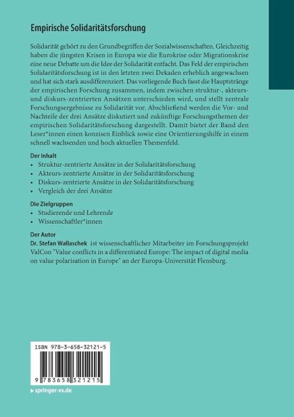 Solidarität gehört zu den Grundbegriffen der Sozialwissenschaften. Gleichzeitig haben die jüngsten Krisen in Europa wie die Eurokrise oder Migrationskrise eine neue Debatte um die Idee der Solidarität entfacht. Das Feld der empirischen Solidaritätsforschung ist in den letzten zwei Dekaden erheblich angewachsen und hat sich stark ausdifferenziert. Das vorliegende Buch fasst die Hauptstränge der empirischen Forschung zusammen, indem zwischen struktur-, akteurs- und diskurs-zentrierten Ansätzen unterschieden wird, und stellt zentrale Forschungsergebnisse zu Solidarität vor. Abschließend werden die Vor- und Nachteile der drei Ansätze diskutiert und zukünftige Forschungsthemen der empirischen Solidaritätsforschung dargestellt. Damit bietet der Band den Leser_innen einen konzisen Einblick sowie eine Orientierungshilfe in einem schnell wachsenden und hoch aktuellen Themenfeld.