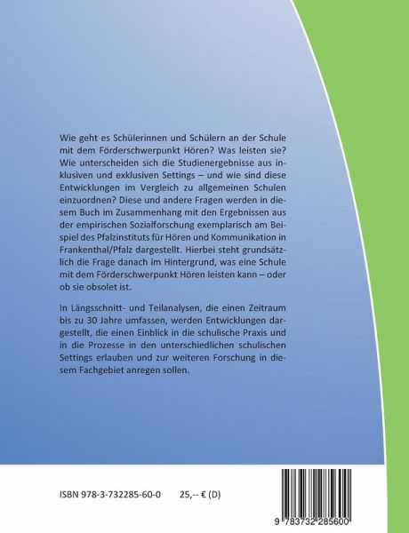 Wie geht es Schülerinnen und Schülern an der Schule mit dem Förderschwerpunkt Hören? Wie unterscheiden sich die Studienergebnisse aus inklusiven und exklusiven Settings - und wie sind dieses Entwicklungen im Vergleich zu allgemeinen Schulen einzuordnen? Diese und andere Fragestellungen werden in diesem Buch im Zusammenhang mit den Ergebnissen aus der empirischen Sozialforschung exemplarisch am Beispiel des Pfalzinstituts für Hören und Kommunikation in Frankenthal/Pfalz dargestellt. Hierbei steht grundsätzlich die Frage danach im Hintergrund, was eine Schule mit dem Förderschwerpunkt Hören leisten kann - oder ob sie obsolet ist. In Längsschnitt und Teilanalysen, die einen Zeitraum bis zu 30 Jahre umfassen, werden Entwicklungen dargestellt, die einen Einblick in die schulische Praxis und in die Prozesse in den unterschiedlichen schulischen Settings erlauben und zur weiteren Forschung in diesem Fachgebiet anregen sollen.