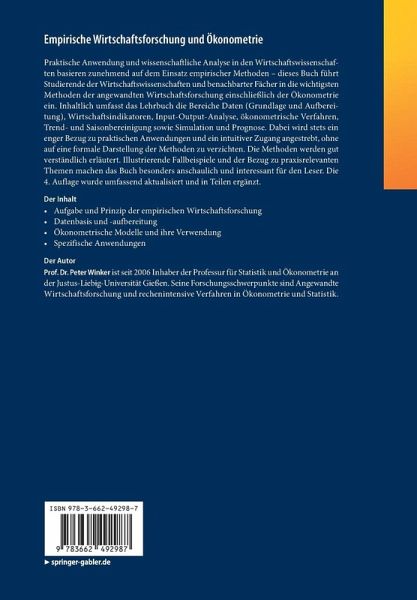 Praktische Anwendung und wissenschaftliche Analyse in den Wirtschaftswissenschaften basieren zunehmend auf dem Einsatz empirischer Methoden - dieses Buch führt Studierende der Wirtschaftswissenschaften und benachbarter Fächer in die wichtigsten Methoden der angewandten Wirtschaftsforschung einschließlich der Ökonometrie ein. Inhaltlich umfasst das Lehrbuch die Bereiche Daten (Grundlage und Aufbereitung), Wirtschaftsindikatoren, Input-Output-Analyse, ökonometrische Verfahren, Trend- und Saisonbereinigung sowie Simulation und Prognose. Dabei wird stets ein enger Bezug zu praktischen Anwendungen und ein intuitiver Zugang angestrebt, ohne auf eine formale Darstellung der Methoden zu verzichten. Die Methoden werden gut verständlich erläutert. Illustrierende Fallbeispiele und der Bezug zu praxisrelevanten Themen machen das Buch besonders anschaulich und interessant für den Leser. Die 4. Auflage wurde umfassend aktualisiert und in Teilen ergänzt.