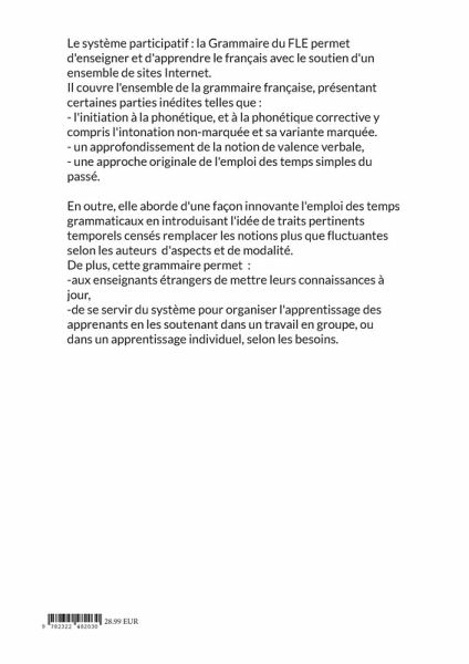 Le système participatif : la Grammaire du FLE permet d'enseigner et d'apprendre le français avec le soutien d'un ensemble de sites Internet.Il couvre l'ensemble de la grammaire française, présentant certaines parties inédites telles que :- l'initiation à la phonétique, et à la phonétique corrective y compris l'intonation non-marquée et sa variante marquée. - un approfondissement de la notion de valence verbale,- une approche originale de l'emploi des temps simples du passé.En outre, elle aborde d'une façon innovante l'emploi des temps grammaticaux en introduisant l'idée de traits pertinents temporels censés remplacer les notions plus que fluctuantes selon les auteurs d'aspects et de modalité.De plus, cette grammaire permet :-aux enseignants étrangers de mettre leurs connaissances à jour,-de se servir du système pour organiser l'apprentissage des apprenants en les soutenant dans un travail en groupe, ou dans un apprentissage individuel, selon les besoins.Un apprentissage en complète autonomie est possible, guidé exclusivement par l'ordinateur qui fournit les explications, les pistes se réflexion, les tests et exercices corrigés individuellement.