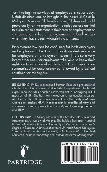 Terminating the services of employees is never easy. Unfair dismissal can be brought to the Industrial Court in Malaysia. A successful claim for wrongful dismissal could prove costly for the organisation. Employees are entitled to claim for reinstatement to their former employment or compensation in lieu of reinstatement and back wages when they have been wrongfully dismissed. Employment law can be confusing for both employers and employees alike. This is a must-have desk reference for employers on employment issues. It is also a very informative book for employees who wish to know their rights on termination of employment. Court awards are summarised for easy reference followed by practical solutions for managers.