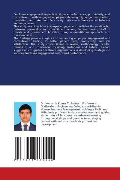 Employee engagement impacts workplace performance, productivity, and commitment, with engaged employees showing higher job satisfaction, motivation, and retention. Personality traits also influence work behavior and engagement.This study examines how employee engagement mediates the relationship between personality and commitment among female nursing staff in private and government hospitals, using a quantitative approach with questionnaires.The findings provide insights into enhancing employee engagement and commitment, leading to better patient care, productivity, and job satisfaction. The…mehr