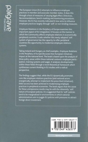 This book examines the manner in which the EU affects employee relations systems in economically peripheral European countries, specifically Ireland and Hungary. It asks whether the EU offers peripheral countries the opportunity to modernise their industrial relations. The EU dynamically promotes core-like employee practices, and national actors energetically attempt to implement the prescribed initiatives, yet little success has been achieved in modernising production techniques in peripheral economies. O'Hagan argues that the EU implements an unofficial development policy which it pressurises States to adopt. These initiatives amount to the frequently referred to European Social Model (ESM), which, she argues, can cause difficulty for policy makers because it is ill-defined, vague and contradictory.
