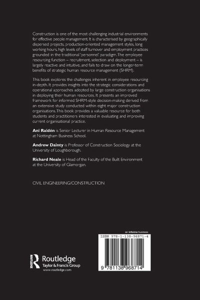 Construction is one of the most challenging industrial environments for effective people management. It is characterised by geographically dispersed projects, production-oriented management styles, long working hours, high levels of staff turnover and employment practices grounded in the traditional 'personnel' paradigm. The employee resourcing function - recruitment, selection and deployment - is largely reactive and intuitive, and fails to draw on the longer-term benefits of strategic human resource management (SHRM). This book explores the challenges inherent in employee resourcing in-depth. It provides insights into the strategic considerations and operational approaches adopted by large construction organisations in deploying their human resources. It presents an improved framework for informed SHRM-style decision-making derived from an extensive study conducted within eight major construction organisations. This book provides a valuable resource for both students and practitioners interested in evaluating and improving current organisational practice.