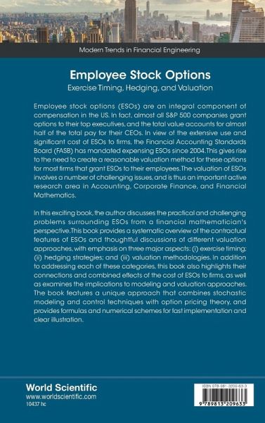 Employee stock options (ESOs) are an integral component of compensation in the US. In fact, almost all S&P 500 companies grant options to their top executives, and the total value accounts for almost half of the total pay for their CEOs. In view of the extensive use and significant cost of ESOs to firms, the Financial Accounting Standards Board (FASB) has mandated expensing ESOs since 2004. This gives rise to the need to create a reasonable valuation method for these options for most firms that grant ESOs to their employees. The valuation of ESOs involves a number of challenging issues, and is thus an important active research area in Accounting, Corporate Finance, and Financial Mathematics. In this exciting book, the author discusses the practical and challenging problems surrounding ESOs from a financial mathematician's perspective. This book provides a systematic overview of the contractual features of ESOs and thoughtful discussions of different valuation approaches, with emphasis on three major aspects: (i) hedging strategies; (ii) exercise timing; and (iii) valuation methodologies. In addition to addressing each of these categories, this book also highlights their connections and combined effects of the cost of ESOs to firms, as well as examines the implications to modeling and valuation approaches. The book features a unique approach that combines stochastic modeling and control techniques with option pricing theory, and provides formulas and numerical schemes for fast implementation and clear illustration.