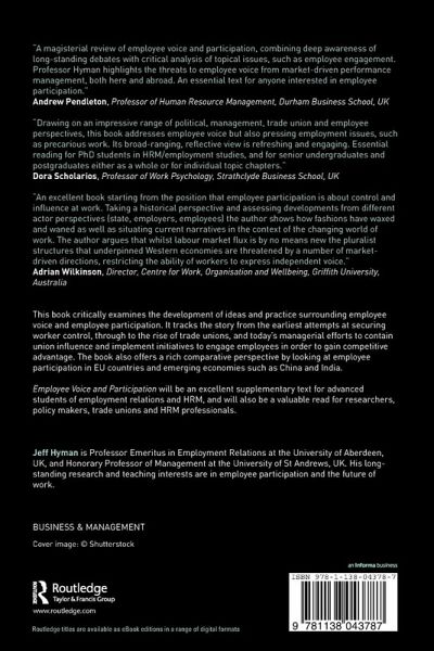 Acknowledgements Abbreviations. Introduction: history and evolution of employee participation Why the need for a new book on employee participation? Problems of definition Measuring EPV Industrial democracy Employee participation Employee involvement Conclusions. 1. Why do employee participation and voice matter? Introduction Links between EPV and democratic values Associations between discretion and autonomy at work and dignity satisfaction employee health and wellbeing Impact of EPV on economic performance and productivity Conclusions. 2. Political perspectives on employee participation and voice Introduction Coordinated and liberal markets The role and impact of legislation Government intervention in the European Union Conclusions. 3. Management perspectives on employee participation and voice Introduction The defensive role of EPV Humanisation of work Strategy and human resource management Organisational and human resource management strategy Management and EPV Conclusions. 4. Employee and trade union perspectives on employee participation and voice Introduction What do employees want? Precarious work A voice for the precarious worker? Voice and silence Employees and trade unions in Europe Conclusions. 5. Profit sharing and employee share ownership - panacea or gimmick? Introduction The range of financial participation Profit-sharing schemes Employee share schemes Employee ownership Conclusions. 6. High-performance work and its antecedents Introduction Origins of HPWS: lean production The influence of people management Research on HPWSs Conclusions. 7. Empowering and engaging employees or simply reinventing the wheel? Introduction Employee empowerment Employee engagement Conclusions. 8. What's not to like about teamworking? Introduction Why teamworking? Types of teams What makes a team? The question of team autonomy Teams and lean Conclusions. 9. Collective participation Introduction The decline of collective bargaining in the UK Collective bargaining experience in Europe Different directions? Joint consultation in the UK and Europe Works councils and codetermination: the experience of Europe Supervisory boards and codetermination Partnership at work: a tale of two systems Conclusions. 10. Internationalisation and the impact of European Works Councils Introduction and background Forms and processes of EWCs Early research on EWCs Revision of the Directive and the 2009 Recast EWC experience following the 2009Recast Conclusions. 11. Global markets and prospects for employee emancipation The context for globalisation China and voice India and voice Conclusions. 12. An uncertain future? Introduction: a contested past EPV: a troubled present EPV: an uncertain future? The impact on the UK of leaving the EU Prospects for EPV Closing the participation gap The future of work. References