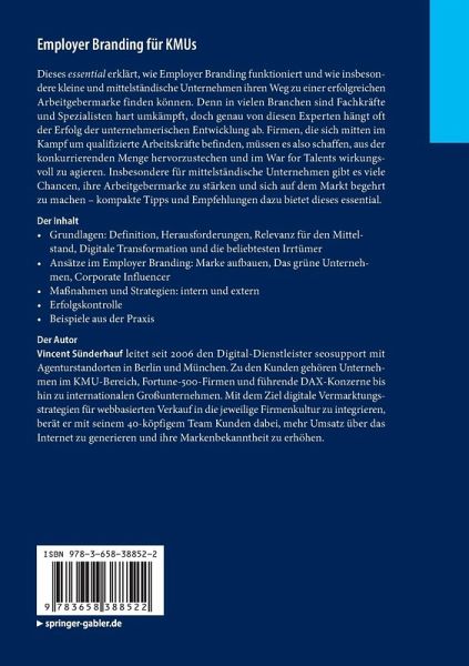 Dieses essential erklärt, wie Employer Branding funktioniert und wie insbesondere kleine und mittelständische Unternehmen ihren Weg zu einer erfolgreichen Arbeitgebermarke finden können. Denn in vielen Branchen sind Fachkräfte und Spezialisten hart umkämpft, doch genau von diesen Experten hängt oft der Erfolg der unternehmerischen Entwicklung ab. Firmen, die sich mitten im Kampf um qualifizierte Arbeitskräfte befinden, müssen es also schaffen, aus der konkurrierenden Menge hervorzustechen und im War for Talents wirkungsvoll zu agieren. Insbesondere für mittelständische Unternehmen gibt es viele Chancen, ihre Arbeitgebermarke zu stärken und sich auf dem Markt begehrt zu machen - kompakte Tipps und Empfehlungen dazu bietet dieses essential.