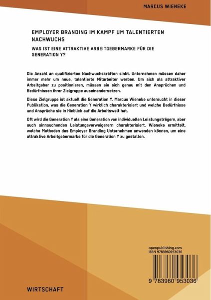 Die Anzahl an qualifizierten Nachwuchskräften sinkt. Unternehmen müssen daher immer mehr um neue, talentierte Mitarbeiter werben. Um sich als attraktiver Arbeitgeber zu positionieren, müssen sie sich genau mit den Ansprüchen und Bedürfnissen ihrer Zielgruppe auseinandersetzen.Diese Zielgruppe ist aktuell die Generation Y. Marcus Wieneke untersucht in dieser Publikation, was die Generation Y wirklich charakterisiert und welche Bedürfnisse und Ansprüche sie in Hinblick auf die Arbeitswelt hat.Oft wird die Generation Y als eine Generation von individuellen Leistungsträgern, aber auch sinnsuchenden Leistungsverweigerern charakterisiert. Wieneke ermittelt, welche Methoden des Employer Branding Unternehmen anwenden können, um eine attraktive Arbeitgebermarke für die Generation Y zu gestalten.Aus dem Inhalt:- Employer Branding;- Generation Y;- War of Talents;- Work-Life-Balance;- Markenbildung
