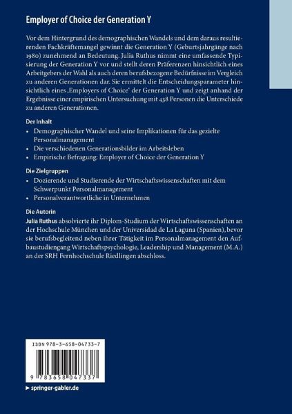 Vor dem Hintergrund des demographischen Wandels und dem daraus resultierenden Fachkräftemangel gewinnt die Generation Y (Geburtsjahrgänge nach 1980) zunehmend an Bedeutung. Julia Ruthus nimmt eine umfassende Typisierung der Generation Y vor und stellt deren Präferenzen hinsichtlich eines Arbeitgebers der Wahl als auch deren berufsbezogene Bedürfnisse im Vergleich zu anderen Generationen dar. Sie ermittelt die Entscheidungsparameter hinsichtlich eines 'Employers of Choice' der Generation Y und zeigt anhand der Ergebnisse einer empirischen Untersuchung mit 438 Personen die Unterschiede zu anderen Generationen.